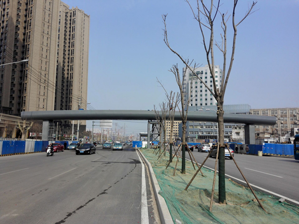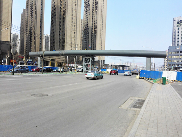 濟(jì)南市市政工程有限公司承建的緯十二路人行天橋工程包含兩座天橋,分別位于經(jīng)二路南側(cè)和經(jīng)五路南側(cè),均橫跨緯十二路。天橋兩側(cè)緊臨普通公交站臺(tái),中間與BRT站臺(tái)相接,橋梁上部結(jié)構(gòu)采用鋼箱梁,橋梁全長(zhǎng)60米,寬4米,共3跨,下部結(jié)構(gòu)采用鋼板墩,共設(shè)置5處步梯及3部垂直升降電梯,梯道寬2.5米。3月16日晚至3月17日凌晨,濟(jì)南市市政工程有限公司項(xiàng)目部進(jìn)行經(jīng)五路南側(cè)人行天橋主箱梁吊裝施工。