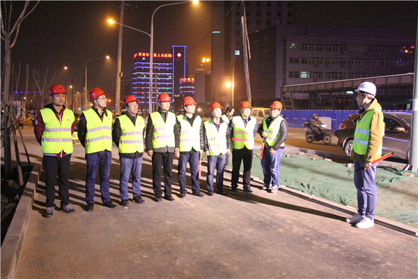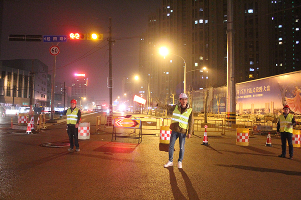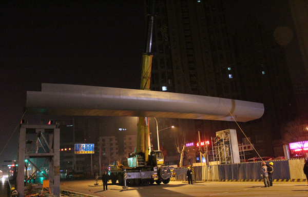 為保證吊裝工作順利進(jìn)行,濟(jì)南市市政工程有限公司項(xiàng)目部提前策劃,與交警等相關(guān)部門充分溝通確定交通組織方案,建立吊裝安全保障小組并明確人員分工;同時(shí)為保證后續(xù)施工道路交通安全,濟(jì)南市市政工程有限公司項(xiàng)目部在南北兩側(cè)設(shè)立了臨時(shí)限高桿。3月16日晚11時(shí)現(xiàn)場(chǎng)正式封閉西半幅快車道吊裝西段主梁,在東半幅快車道中間進(jìn)行隔離,南行及北行車輛分車道行駛,盧浮公館小區(qū)東門與緯十二路交叉口在西側(cè)箱梁吊裝期間進(jìn)行封閉,車輛及行人繞行小區(qū)西門或南門。西段主梁吊裝完成后封閉東半幅快車道,吊裝東段主梁。濟(jì)南市市政工程有限公司于3月17日凌晨4時(shí)完成經(jīng)五路人行天橋主箱梁吊裝施工。