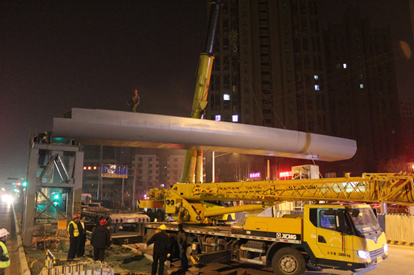 濟(jì)南市市政工程有限公司緯十二人行天橋工程進(jìn)行主箱梁吊裝施工